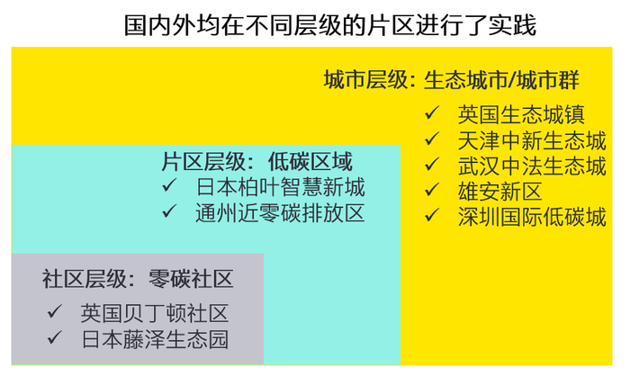 国外城市集中在建筑能效、可再生能源、废物处理、绿色交通等领域进行了长时间碳中和路径的探索。在国内,碳中和主要经历了三个阶段的探索与实践:初期主要与国外合作共建生态城;中期探索建设低碳试点城市;目前,国家已高规格提出了发展区域及城市群碳中和。围绕面向城市碳中和的远景实现,国内外在城市、片区和社区不同尺度均进行了绿色低碳发展的路径探索与实践。