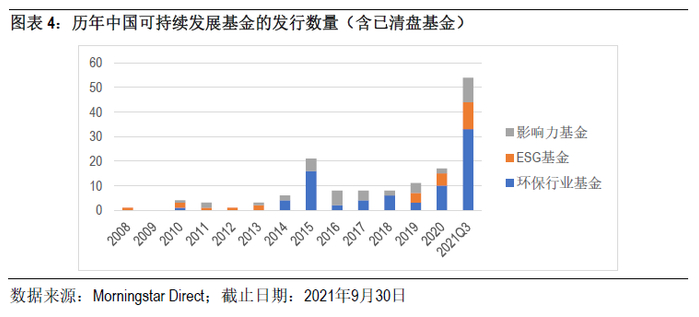 截至2021年9月30日,中国可持续发展基金数量增长至138只,较2020年底增加62%。2021年前三季度发行的可持续发展基金的数量为54只,其中有43只为环保行业基金或聚焦于低碳经济和“碳中和”的主题基金。