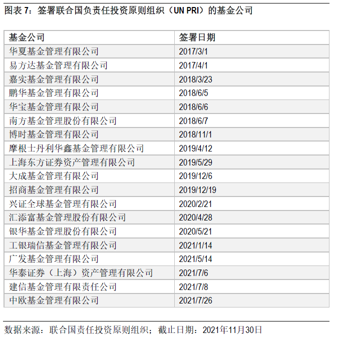 此外,签署《联合国负责任投资原则》(UN PRI)的中国公募基金公司数量从2017年底的2家增加至2021年11月底的19家,其中多数为大型基金公司。截至2021年9月30日,这些签署机构旗下管理的总资产规模(不含货币基金和联接基金)超过7万亿元。