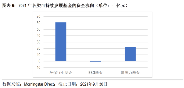 2021年,中国可持续发展基金延续了2020年强劲的发展趋势,在前三季度共吸引了818亿元资金的流入,其中608亿元流向了环保行业基金,224亿元流向了影响力基金,而ESG基金则出现了14亿元的资金净流出。