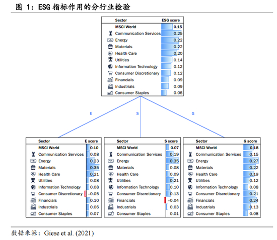 2)从行业来看,材料主要受到E影响;能源主要受到S影响;大部分行业受到G影响。具体来讲,①在环境(E)指标结果中,材料、医疗保健和能源部门受影响最大。②在社会责任(S)指标结果中,能源、公用事业和通信服务里面影响最大。这是由于在这些行业中,员工安全和劳动者关系问题十分重要。这些风险问题解决不好将带来短期公共事件,因此在此类行业中,社会责任(S)指标有了更强的影响。③在公司治理(G)指标结果中,能源和金融行业受影响最大。