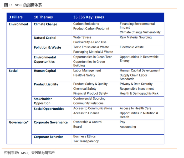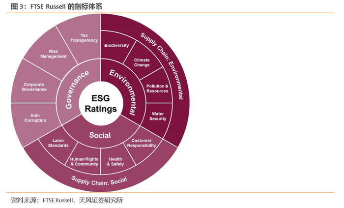 FTSE Russell的ESG评价体系有三层结构:第一层是环境、社会和公司治理3个支柱;第二层是14个主题指标,其中环境类指标包括生物多样性、气候变化、污染与资源、水安全、供应链环境等5项,社会类指标包括劳工标准、人权与社区、健康安全、消费者责任、供应链社会影响等5项,公司治理类指标包括反腐败、企业管理、风险管理、税收透明度等4项;第三层是适用于分析每家公司具体情况的300多个独立评估指标。指标权重的给定参考敞口大小,最重要的ESG问题被赋予最大的权重。最终每家符合条件的公司会获得一个分值在0至5分之间的ESG整体评分。