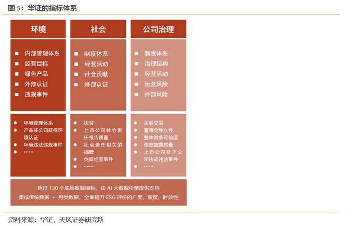 华证ESG评价体系分为ESG评级和ESG尾部风险两个部分。ESG评级涵盖一级指标3个、二级指标14个、三级指标26个,底层数据指标超过130个,相较境外市场融入了更多贴合国内当前发展阶段的指标,如信息披露质量、证监会处罚、精准扶贫等。底层指标自下而上按照行业权重矩阵加总,即可得到公司的ESG评分和最终AAA-C的九档评级。ESG尾部风险更侧重负面信息的监控,将公司分为严重警告、警告、关注、低风险四类。