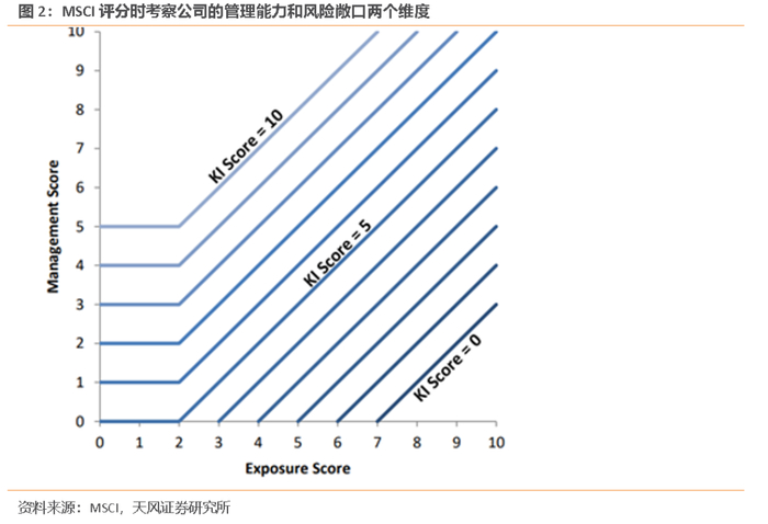 对底层指标评分时,MSCI主要考察公司的管理能力和风险敞口两个维度,其中管理能力主要考察公司战略和业绩表现,如果出现争议事件将扣除相应分数;风险敞口主要考虑公司的业务特征,例如核心产品特点、运营地点、生产是否外包、对政府订单依赖程度。公司的管理能力越强、风险敞口越小,得到的分数就越高,反之越低。