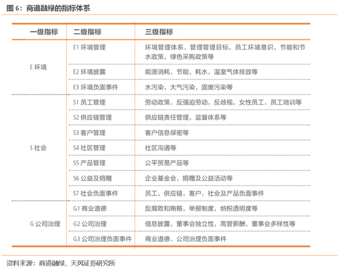 商道融绿ESG评级系统共包含三级指标体系:一级指标为环境、社会和公司治理三个维度;二级指标为环境、社会和公司治理下的13项分类议题,如环境一级指标下的二级指标包括环境目标、环境管理、环境负面事件等;三级指标涵盖具体的ESG指标,共有127项三级指标,例如社会方面的三级指标包括劳工政策、员工政策、女性员工、多样化、供应链责任管理等30多项指标。商道融绿会根据行业特性设置权重,也会对各行业指派行业特定指标,以更好把握不同行业的可持续发展绩效。