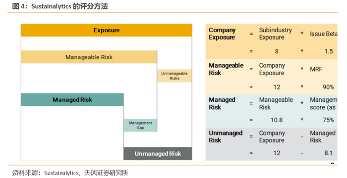 Sustainalytics结合风险敞口和管理能力对各指标进行评分,步骤如下:首先,通过事件追踪、公司报告、外部数据和第三方研究计算行业的风险敞口,根据生产、融资、事件和地域特征确定每个公司的beta系数,两者相乘得到公司的风险敞口;其次,考察公司对员工的管理能力(例如职业健康和安全)、外部参与者对公司管理能力的影响(例如网络安全)、问题的复杂性(例如全球供应链)以及创新的技术限制(例如碳排放)等四个主要因素,确定行业层面风险敞口有多大比例不可控,得到可控风险因子MRF,继而计算出公司可控风险敞口大小;再次,根据管理体系和管理结果计算公司的管理得分,再乘以可控风险敞口得到受控风险;最后,用公司风险敞口减去受控风险,对公司未管理风险进行评分。