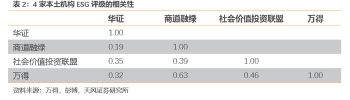 为排除海外机构覆盖A股公司数量较少可能引发的偏差,我们以4家本土机构均有覆盖的479家A股上市公司为样本做了验证。两两机构的评级相关性在0.19-0.63之间,中位数为0.37,说明国内机构并未就A股公司ESG评级达成较为统一的意见。