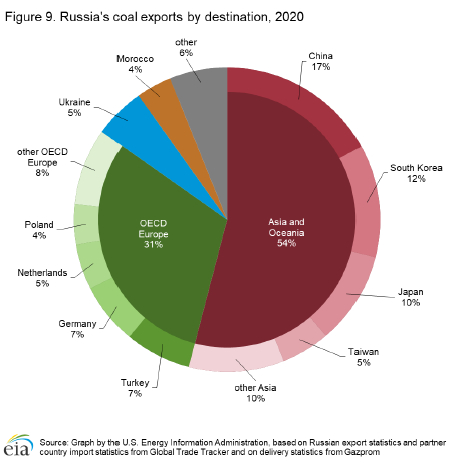截至2019年底,俄罗斯的煤炭储量约为1790亿短吨,使其成为世界上第二大可采煤炭储量持有者,仅次于美国。