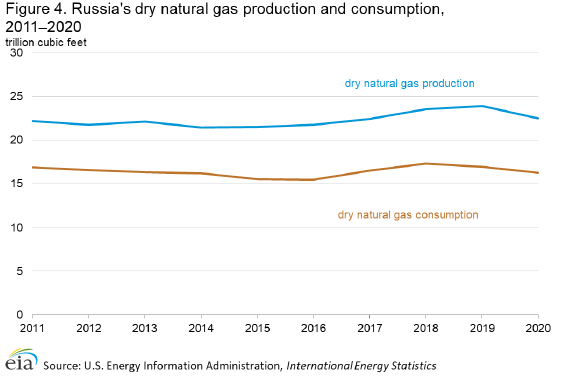 2020年,俄罗斯生产了约22.5万亿立方英尺的干天然气,消耗了16.3万亿立方英尺的干天然气(图4)。