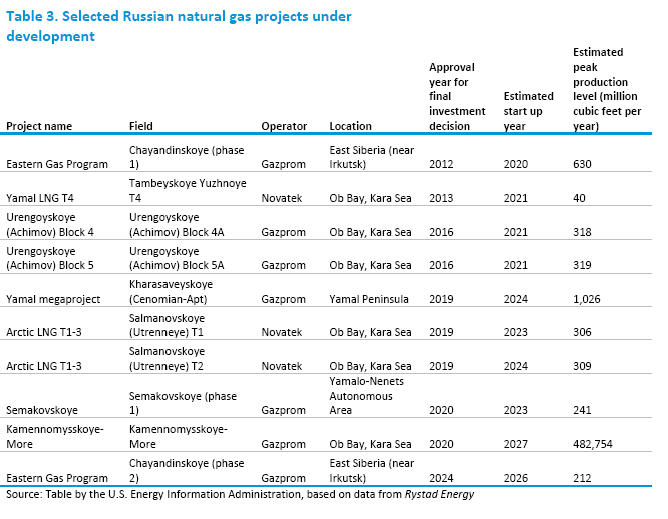 近期一系列的俄罗斯北极地区的天然气的发现,尤其是在亚马尔半岛和鄂毕湾,未来十年可能会增加天然气产量,导致该地区成为一个天然气补充西伯利亚西部的中心,大多数俄罗斯天然气的历史。2018年,诺瓦泰克宣布发现位于鄂毕湾的诺瓦泰克北极油田,估计其天然气储量超过11.3万亿立方英尺。2020年5月,俄罗斯天然气工业股份公司估计,位于亚马尔半岛的75 Let Pobedy油田拥有超过7.1万亿立方英尺的可采储量。这两个发现如果完全实现,将显著增加俄罗斯的天然气产量(表3)。