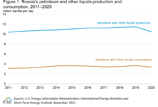 2020年,俄罗斯是世界第三大石油和其他液体生产国(仅次于美国和沙特阿拉伯);它的液体燃料年产量平均为1050万桶/天。2020年,俄罗斯是第二大干天然气生产国(仅次于美国),产量估计为22.5万亿立方英尺。