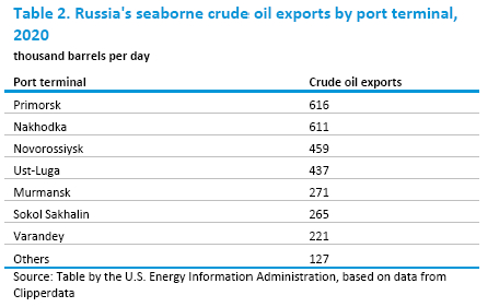 俄罗斯4个最大的原油出口港口(波罗奈斯克、纳霍德卡、新罗西斯克和鲁戈港)合计占2020年俄罗斯海上原油运输总量的71%(表2)
