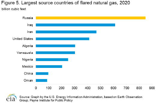 根据美国国家海洋和大气管理局(NOAA)地球观测组的数据,俄罗斯2020年燃烧了约849亿立方英尺的天然气,是世界上燃烧天然气最多的国家,约占2020年全球燃烧天然气总量的17%。(图5)。