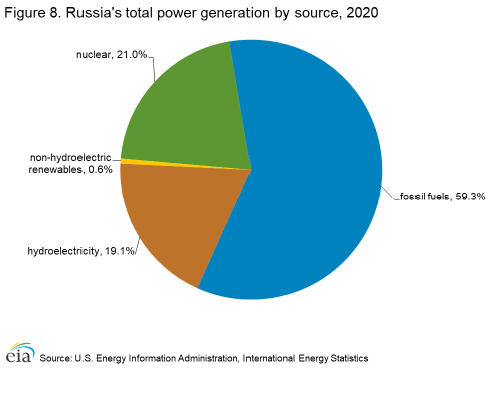 2020年,俄罗斯的总发电量为10270亿千瓦时(kWh)。俄罗斯约60%的电力来自化石燃料,其余大部分来自核能和水力发电(图8)。俄罗斯通过风能和太阳能等其他可再生能源发电的比例很小。
