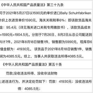 3月12日,Bally全资控股子公司巴丽(上海)商业有限公司北京分公司因以次充好,违反《中华人民共和国产品质量法》第三十九条,被北京市朝阳区市场监督管理局罚款41930元,没收违法所得4085.5元。