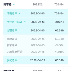 在新浪财经ESG评级中心可查询到博通的ESG评分,路孚特评分为73.6(B+),富时罗素评分为2.3分,处于中等水平。但深究其治理维度下的管理评分,可以看到路孚特在这一项仅给出了62(B)分,远低于环境和社会维度评分,这说明博通在公司管理方面表现欠缺。