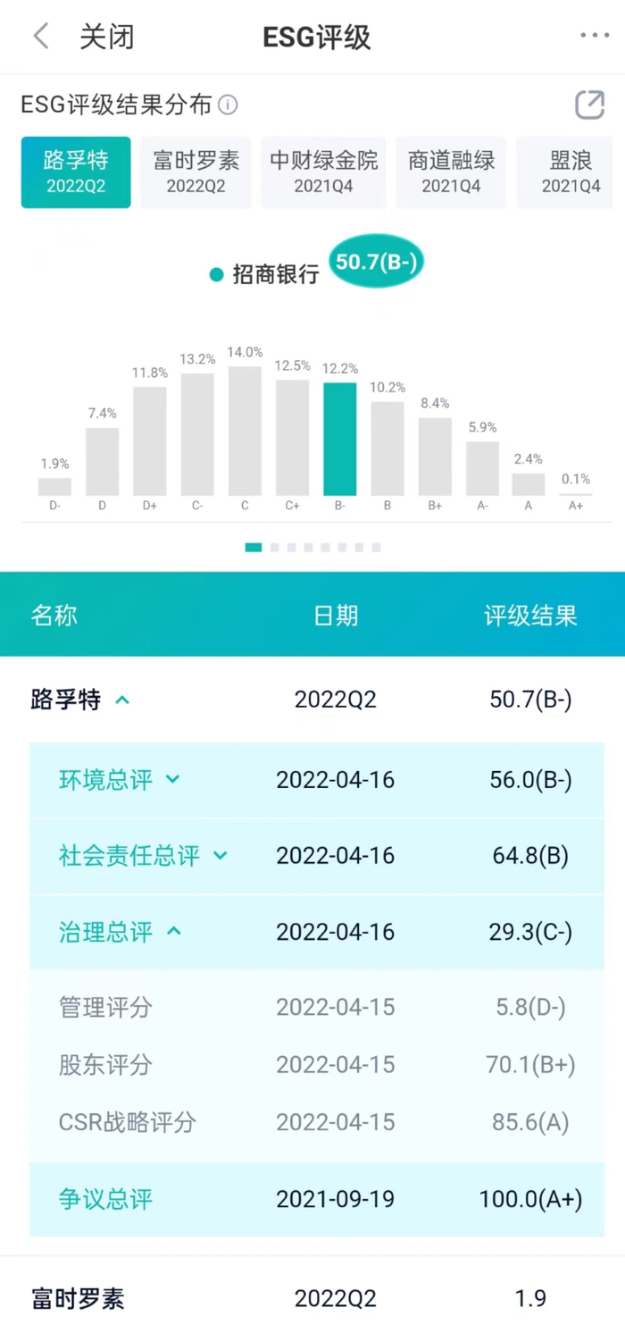 通过新浪财经ESG评级中心,可以看到招商银行ESG综合分数较低。其中,路孚特认为招商银行管理表现差,给出了5.8的低分。