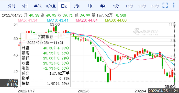 4月25日,招商银行A股早间低开,股价再次跌破40元。