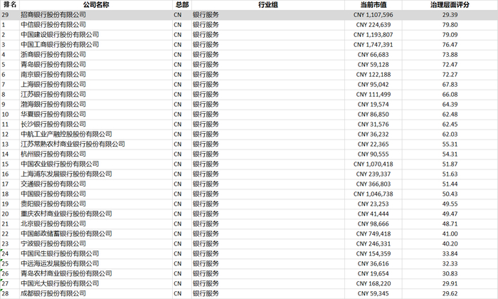 根据路孚特评级系统,我国银行服务业企业共有39家,其中就治理(G)来看,招商银行排名29位。