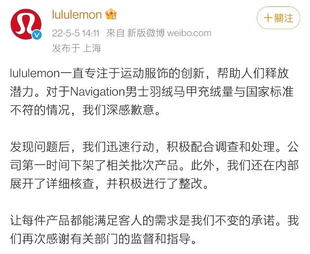 当日下午,lululemon官方微博迅速发表致歉声明,对于Navigation男士羽绒马甲充绒量与国家标准不符的情况深感歉意,表示积极配合调查和处理,第一时间下架了相关批次产品,还在公司内部展开了详细核查,并积极进行了整改。