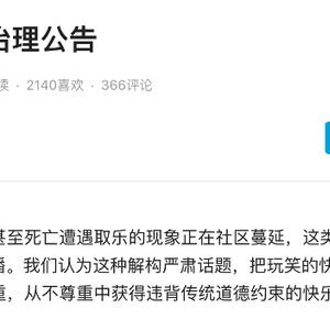 5月11日,哔哩哔哩弹幕网 B站在其官方网站发布《社区“尊重”专项治理公告》。公告指出,针对社区内利用他人死亡、病痛或伤残等悲惨遭遇,来博取他人眼球和吸引流量的“地狱笑话”,和挑拨人群对立、立场先行、发表歧视仇恨言论的部分互动及内容, 将于近期在社区内展开 “尊重”专项治理。