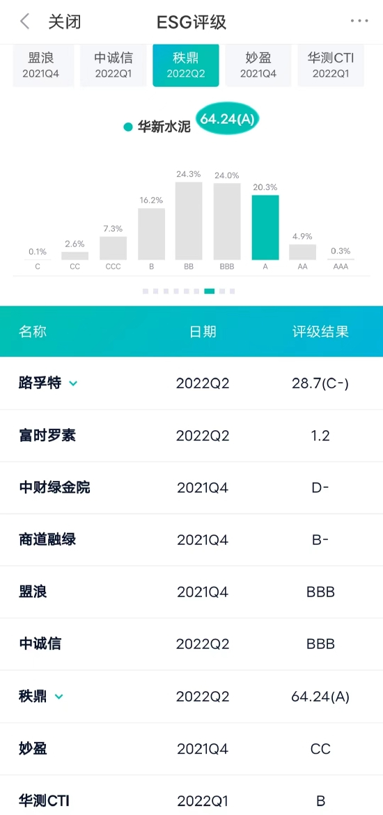在新浪财经ESG评级中心查询,目前华新水泥的ESG评级普遍位于行业中游水平。我们希望,企业在关注以碳排放为首的环境绩效的同时,也加强社会责任和公司治理水平,全面提升公司的可持续发展竞争力,打造中国高质量发展企业。