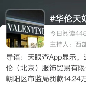 日前,华伦天奴关联公司范伦(北京)服饰贸易有限公司朝阳第四分店,因违反产品质量法被北京市朝阳区市监局罚款14.24万元。24日下午,“华伦天奴以次充好被罚14.24万”相关话题登微博热搜榜。