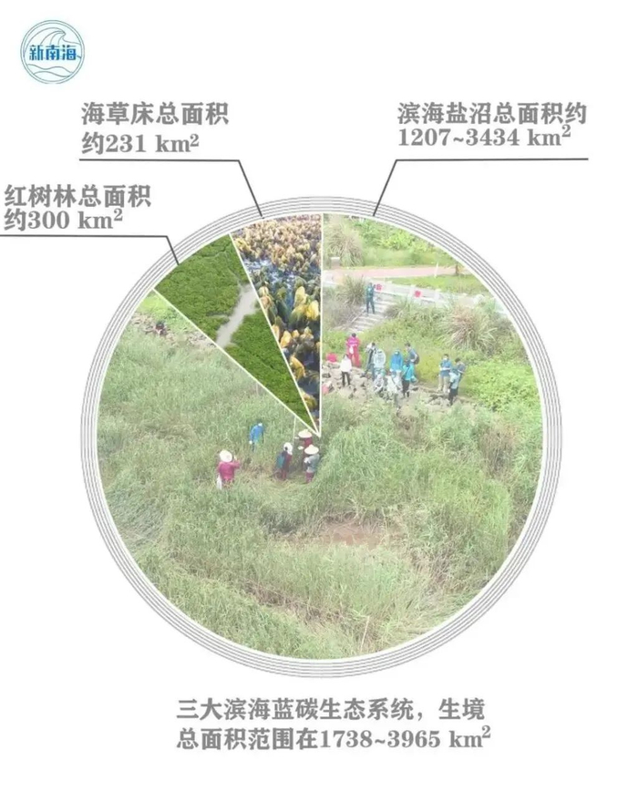 我国海岸线绵长,沿海地区广泛分布着红树林、海草床和盐沼这三大滨海蓝碳生态系统,生境总面积在1738平方公里至3965平方公里。