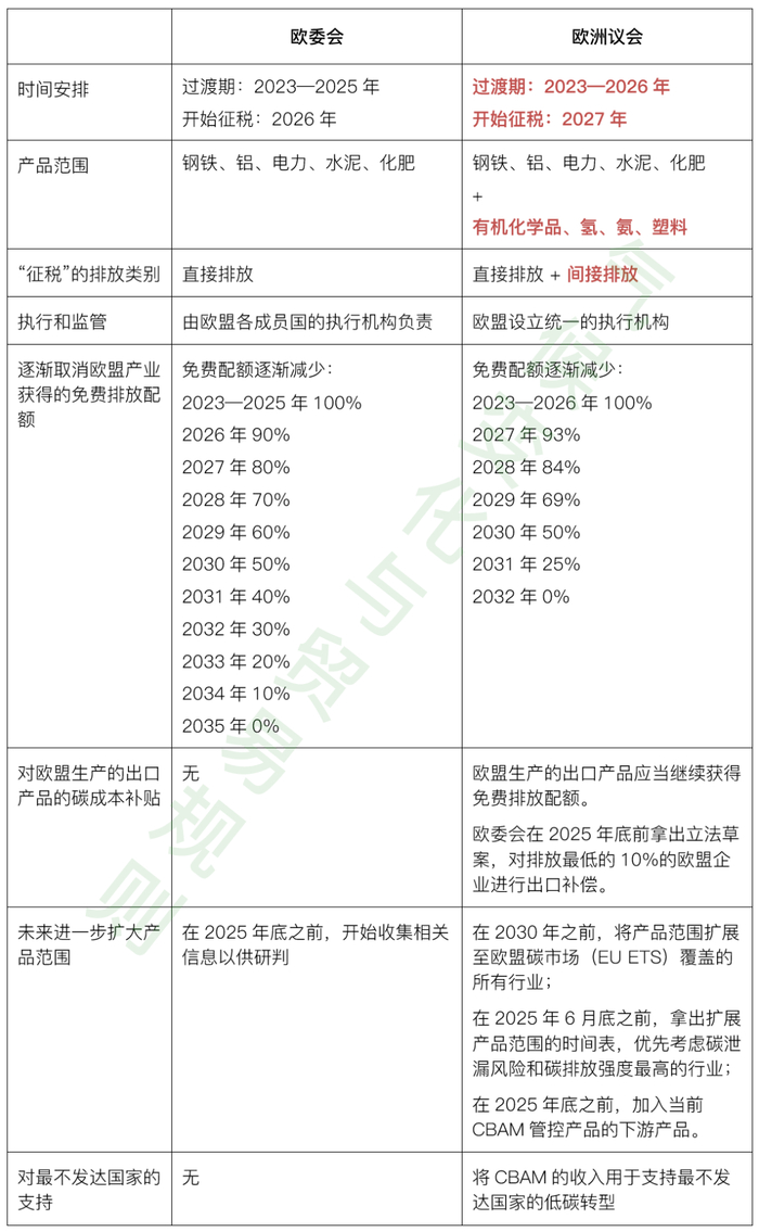 因为投票刚刚结束,所以现在还看不到整合的正式文本。笔者暂根据欧洲议会的投票结果和投票前公布的修正意见(相当于候选人名单),归纳一下欧洲议会的CBAM方案与欧委会方案的重要不同之处。等到整合的正式文本公布后,不排除有稍作更正的可能。