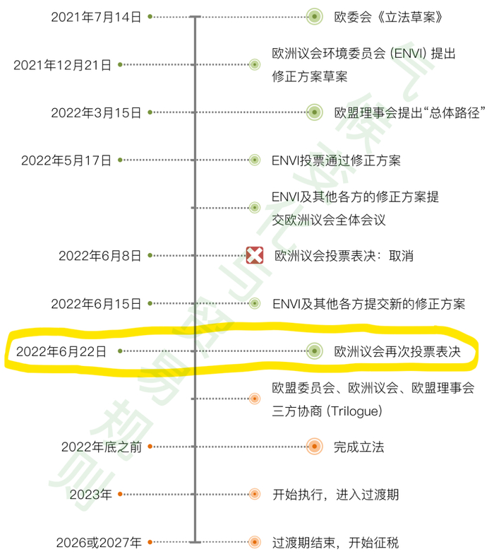 此前,在今年3月15日,当欧洲议会尚未形成“一读”意见时,欧盟理事会就已经拿出了一个“总体路径”(General approach)。通过这个文件,欧盟理事会已经表明了它的基本态度,并传递给了欧洲议会。现在这三方都形成了各自的CBAM方案。欧盟理事会基本上接受了欧委会的方案,而欧洲议会则对欧委会的方案有较大修改。接下来要看他们能否通过“三方会谈”形成一个都能接受的方案。从现在到完成立法还有一段路要走。预计整个立法程序会在2022年底之前完成。