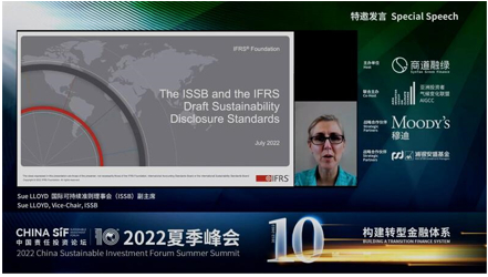 随后,国际可持续准则理事会(ISSB)副主席Sue LLOYD做了特邀发言。她介绍,ISSB由国际财务报告准则(IFRS)基金会在2021年第26届联合国气候变化大会上发起,旨在制定统一的可持续发展报告准则。她分享了ISSB近期发布的两份可持续披露准则文件征求意见稿的主要内容,即《国际财务报告可持续披露准则第1号——可持续相关财务信息披露一般要求(征求意见稿)》和《国际财务报告可持续披露准则第2号——气候相关披露(征求意见稿)》,并呼吁大家在七月底之前积极提供反馈。