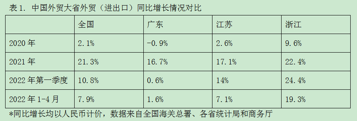 聚焦到中国外贸前三大省份广东、江苏、浙江,2021年,三省合计贡献了45.1%的全国外贸总份额。而2022年1-4月,上述三省的进出口增长分别为1.6%、7.1%和19.3%。其中广东和江苏的进出口增长均低于全国水平(7.9%),仅浙江保持了较高水平增长。