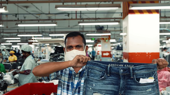 图:一家正规孟加拉服装厂中,工人展示一件American Eagle牛仔裤