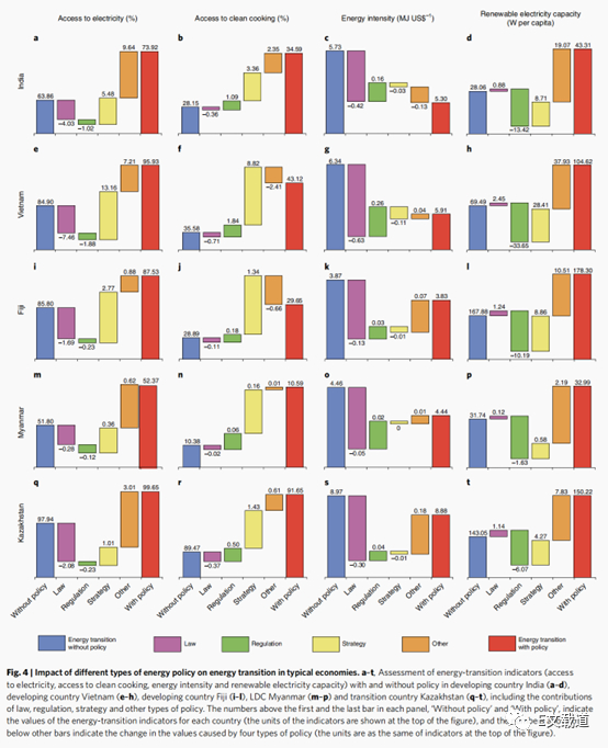 该研究进一步将亚太地区的能源政策按照战略、法律、法规和其他四种类型分类,并讨论以上四种能源政策类型对各国能源转型的推动效果(Fig4)。总体而言,法律能够更有效地提升能源效率,而能源战略则在推进电气化、清洁烹饪和可再生发电容量的发展中起到更重要的作用。以越南为例,该国在近十年来推出了一系列中长期发展战略,有效促进了该国电气化发展和可再生能源的应用。