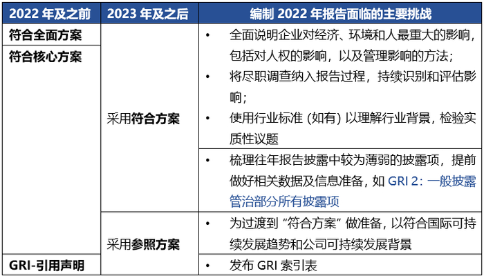 鉴于过往大多数国内企业在使用GRI标准编制报告时采用的是“符合核心方案”或“GRI-引用声明”(国内常见表述为“参考标准”)的方式,国内企业在编制2022年可持续发展报告时将面临部分披露项内部数据信息不全带来的挑战。