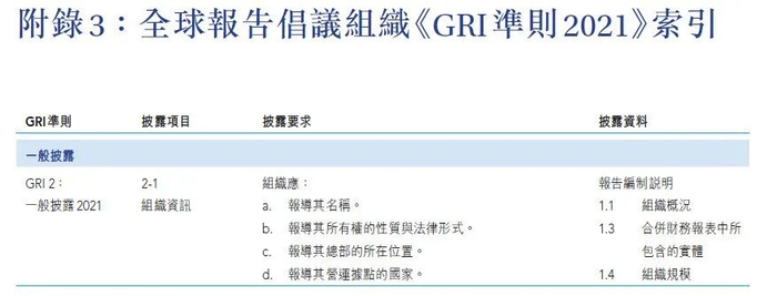 原先使用符合核心方案的海通国际(665.HK)在编制2021年报告时采用了参照标准的方式,报告内容上则是按照符合标准的要求就相关的所有披露项进行了回应,在内容索引表编制上也主要参考符合标准的内容索引模板。