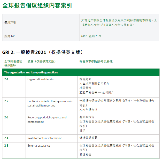 原先使用符合全面方案的太古地产(1972.HK)在2021年可持续发展报告编制时采取了符合标准的方式。鉴于官方未有内容索引的中文版本,太古地产的GRI内容索引表披露项目保留了英文的表达方式。