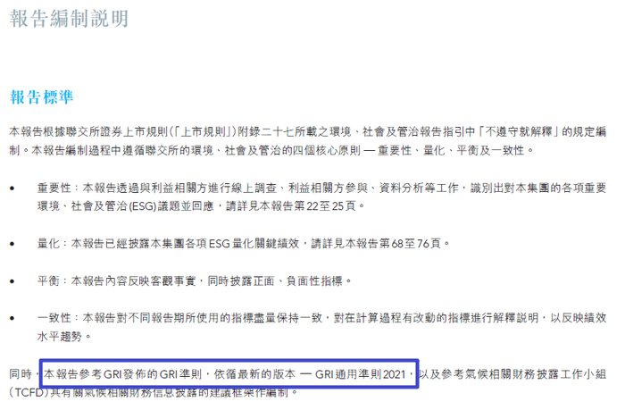 值得一提的是,尽管GRI标准(2021版)于2023年1月1日正式生效,部分企业如太古地产、海通国际等,在编制2021年报告时已尝试使用了新版标准。