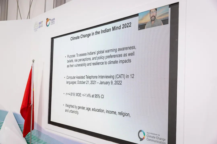 耶鲁大学气候传播项目中心主任安东尼·莱斯维茨博士介绍了全球110个国家及美国的公众气候认知情况。世界大学气候变化联盟执行秘书长、中国气候传播项目中心联合发起人、首席研究员王彬彬博士发布中国公众气候认知调研数据。新西兰奥克兰大学资深讲师雅阁迪斯·泰克博士介绍了印度公众对于气候变化问题的认识。来自深圳的陈素平先生分享了气候影视提升公众认知的实践案例。本场边会由国家气候战略中心对话合作交流部主任张志强主持。世界大学气候变化联盟青年团积极参与了问答和对话环节。