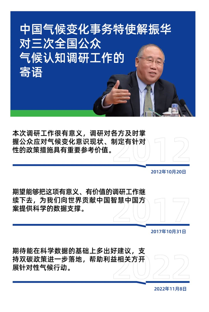 解振华肯定中国气候传播项目中心坚持用科学的调研方法开展全国范围的公众气候变化认知调查。从2012年起,在每次国家五年发展规划发布的第二年,中国气候传播项目中心都会测试中国公众对气候变化问题、影响、应对、政策的认知度、气候行动的执行度及传播渠道、内容、信息源的效果,得出的数据支撑国家发展规划和相关政策落地实施,也帮助国际社会更好地认识中国,了解中国。解振华表示:“期待中国气候传播项目中心能在科学数据的基础上多出好建议,支持双碳政策进一步落地,帮助利益相关方开展针对性气候行动。”