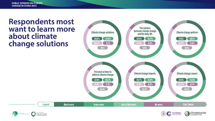 调研显示,95.9%的受访者认为气候变化正在发生,78.1%的受访者表示担心气候变化,94.4%的受访者认为气候变化对个人而言是重要问题。“过去十年,中国公众对气候变化问题的认知保持在一个较高的水平,但相比采取实际行动的意愿,中间有一个明显的差距。”王彬彬介绍:“最新的调研发现,中国公众希望更多了解应对气候危机的解决方案及该问题与日常生活的关系,也愿意为气候友好型产品买单,这是一个积极的信号,需要从气候变化与其他可持续发展目标协同的角度多出一些公众喜闻乐见的创新行动点。”