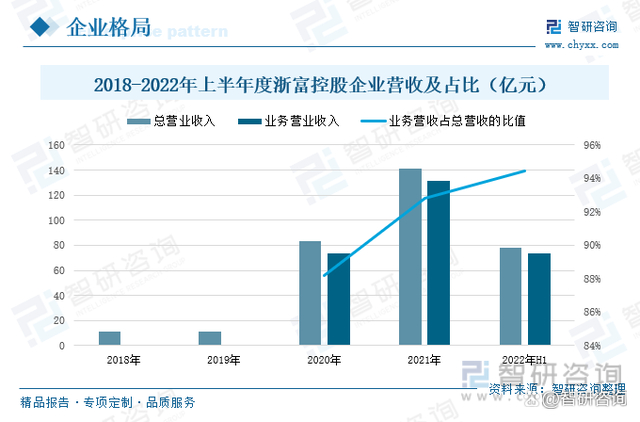 浙富控股业务领域主要涉及危废资源化、清洁能源装备板块。在“清洁能源、大环保”发展战略指引下,公司聚焦危险废物无害化处置及资源化回收利用领域,拥有集危险废物“收集-贮存-无害化处理-资源深加工”前后端一体化的全产业链危废综合处理技术与设施。2020年以来,浙富控股加快布局固废危废资源化利用领域,并取得了优异的成效,2021年浙富控股固废危废资源化利用业务的营业收入为131.2亿元,较2020年增长了78.26%,占2021年总营业收入的92.82%。2022年上半年浙富控股的总营业收入为78.04亿元,较2021年同期增长了13.54%;固废危废资源化利用的营业收入为73.72亿元,同比增长了13.63%。