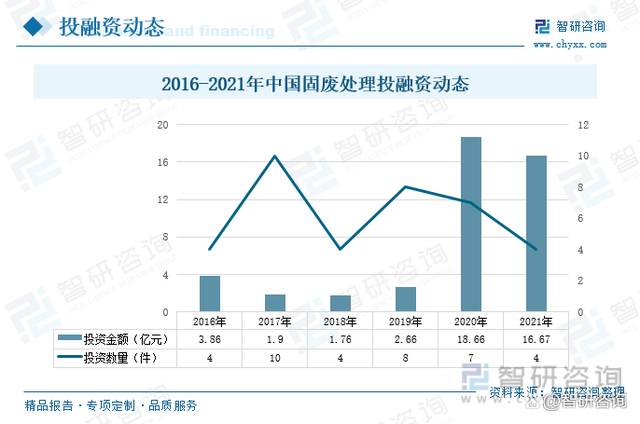 近年来,随着国家和各级政府对于固废危废行业的扶持力度逐渐增大,行业发展提速,也逐渐受到资本市场的关注,2020、2021年行业获得投资金额均突破15亿元,达18.66亿元、16.67亿元,较往年迎来大幅增长。“十三五”“十四五”期间,固废危废的资源化利用得到快速发展,行业所获得的资金持续增加,给行业带来了新的发展机遇,行业发展步入新阶段。