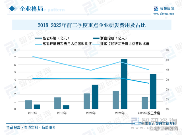 2018年以来,高能环境和浙富控股对于科研投入都较为重视,持续增加对于技术和项目的研发投入,高能环境在此期间的费用投入较为稳定,保持增长的态势,浙富控股2020年在固废危废资源化利用领域布局过后,研发费用激增,2020年过后,研发费用大幅度增长。2022年前三季度高能环境的研发费用为1.62亿元,较2021年同期增长了24.47%,占总营业收入的2.62%;浙富控股的研发费用为4.73%,同比微涨了0.3%,占总营业收入的4%。两家企业对于固废危废处置行业的技术研发都较为重视,研发费用逐年递增,但总体上占总营收的比重小,存在较大的增长空间。