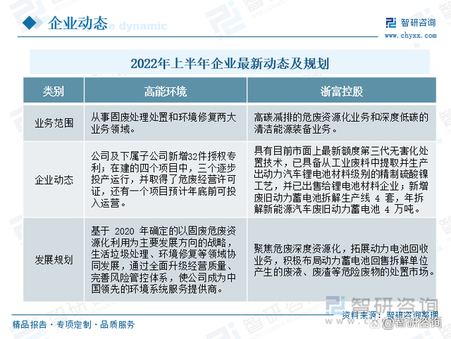 2022年上半年,高能环境在科研专利上取得了显著的成果,公司及下属子公司新增32件授权专利,并持续加大工程建设,在建的四个项目中,三个逐步开始投产运营,并获得了危废经营许可证,另外一个项目预计年底前可投入运营。在此期间,浙富控股则着重拓展动力电池回售业务,新增废旧动力蓄电池拆解生产线4套,年拆解新能源汽车废旧动力蓄电池4万吨,积极布局动力蓄电池回售拆解单位产生的废液、废渣等危险废物的处置市场。