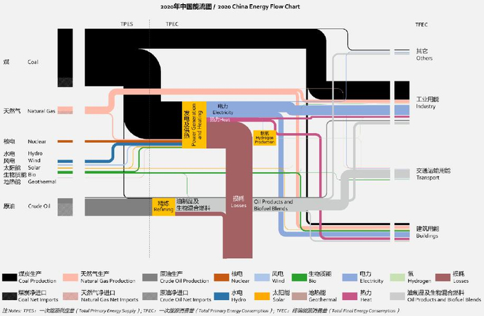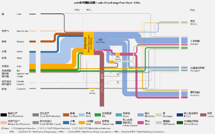 如下图所示,能源系统的重大变化体现在 2020 年和 2060 年的能源流差异中。由于电气化和能效措施,2060 年的最终能源消耗总量将低于 2020 年,太阳能和风能的大量使用将电力部门的损失降至最低,并大幅降低整体煤炭消耗量,以确保在2060 年前实现碳中和。