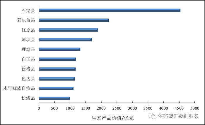 四川省生态产品价值排名较高的市区依次是石渠县、若尔盖县、红原县、阿坝县、理塘县、白玉县、德格县、色达县、木里藏族自治县、松潘县。其中石渠县的生态产品价值最高,达到4532.29亿元,占全省总价值的10%。