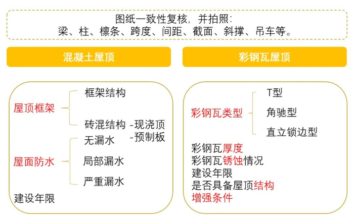 •考察屋面结构(混凝土、彩钢瓦)、屋顶使用年限和面积(至少2万平米以上)。