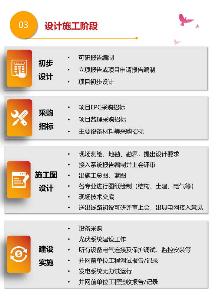 ✔现场测绘、地勘、勘界、提出设计要求 ✔接入系统报告编制并上会评审出施工图、蓝图 ✔各专业进行图纸绘制(结构、土建、电气等) ✔现场技术交流 ✔送出线路初设可研评审上会, 出具电网接入意见 | ✔设备采购 ✔光伏系统建设工作 ✔所有设备电气连接及保护调试、监控安装等 ✔并网前单位工程调试报告/记录发电系统无力试运行 ✔并网前单位工程验收报告/记录 |
