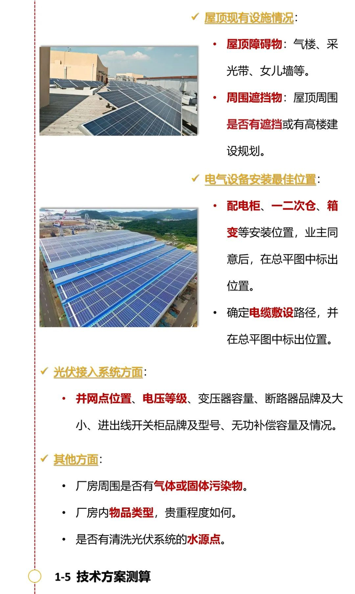 并网点位置、电压等级、变压器容量、断路器品牌及大小、进出线开关柜品牌及型号、无功补偿容量及情况。 | 厂房周围是否有气体或固体污染物。 厂房内物品类型,贵重程度如何。是否有清洗光伏系统的水源点。 |